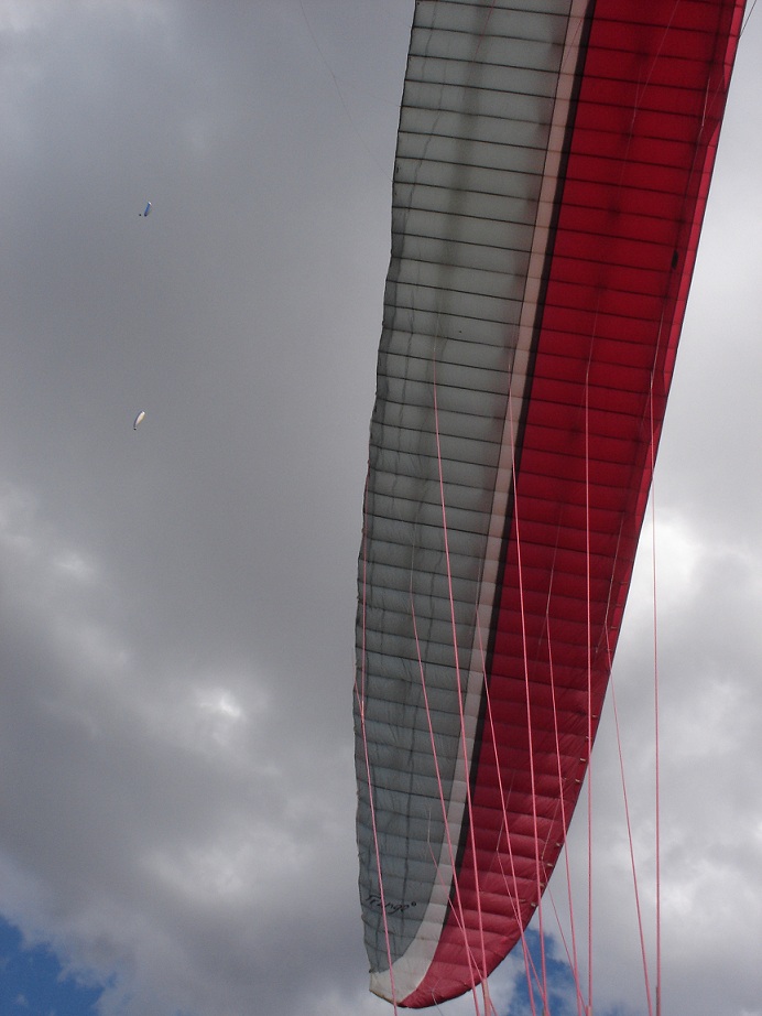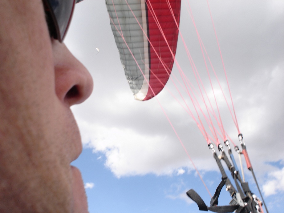 Benson Lamb kindly loaned me his new Airwave Cobra; I wanted to try the three riser wing with a glide over 9.0. I crossed my risers on the first hook-up - no surprise to those who know me - so Tom Pipkin stopped drooling long enough to push ahead of me and got off the hill first. As I spread out, the other pilots "ooohed and aaahed" at Tom's perilous ascent in a raggedy and rowdy thermal directly off launch. I never saw it, so Tom would bear better witness, but it was a harbinger of things to come.