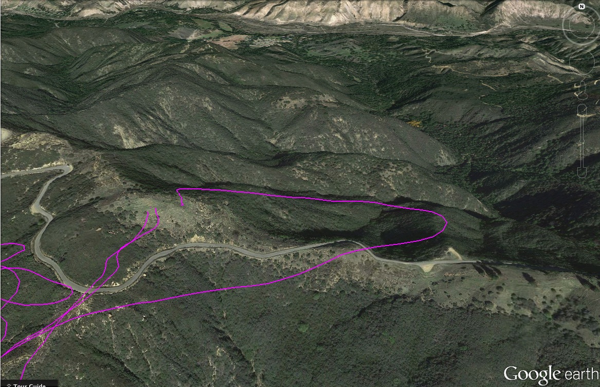 This Montecito Peak 'miss' really isn't a miss... as you can tell, I was ok with completely banking out front of the Peak (when I found lots of turbulence approaching it from the side)... then... once over the front, tried a brief small thermal, but decided to move to the next place likely... which gave me a little 200 foot climb, enough to get to the next setup...