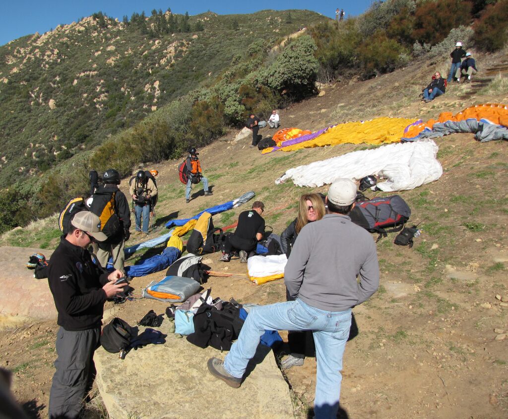 At 9:30 AM, Bob Hurlbett called me and asked if I wanted to drive up to Alternator or Skyport with Kevin Dumain. I hadn't checked the weather page - or my gear, since Bob, Benson and Brendan retrieved it from Montecito Peak two months ago - but it seemed as good a day as any to shake off the cobwebs after my eight week "sabbatical." I pulled my gear out of the garage; there were twigs and debris in the lines, the harness was a bit torn up and my reserve was hanging out behind. Kevin helped me get it all untangled and the reserve repacked. We were late getting started and Kevin drove up to launch. There must have been over 25 cars on Rockwood at Parma Park, more than I had ever seen. As we wound through the Tea Fire landscape, we saw 10-15 pilots in the air with cumis everywhere. We pulled into Skyport and parked. There were all my friends: Ben, Irene, Parma Chris, Magic Mike, Jim M., Bo and dozens of new and other pilots.
