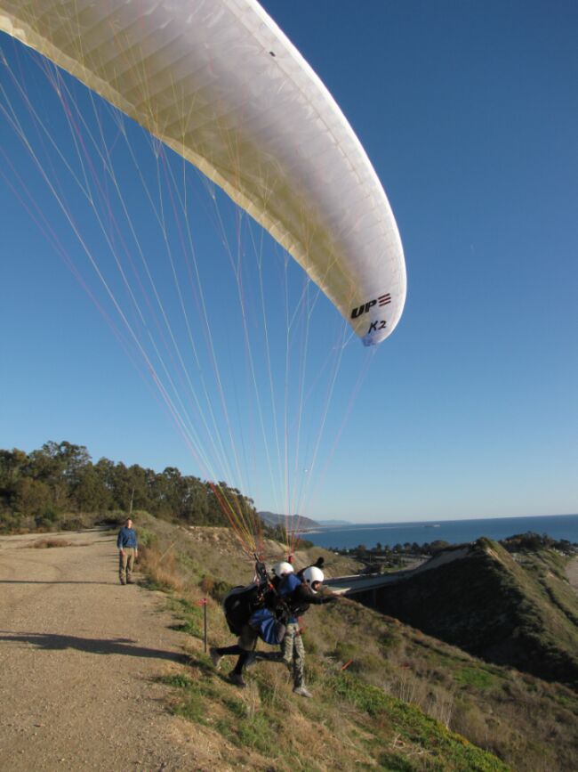 What an unusual day! It was great to see so many folks come out for a day that, at least on paper, should have been stellar! Judging by the first 10 or so to get off, it was. Unfortunately Chip and I were the first off into the approaching West/NorthWest wind. While the leaders were reporting 4k at montecito, I scratched pitifully at the powerlines, then down to the AF. Clearly the strong west, scrubbed clean hillsides, with a stellar lapse rate isn't a good combination. After an impromptu maneuvers course and losing any and all control of the glider 3 times in the same sharp disorganized thermal Chip pulls up to me, wingtips touching, and says "wtf do we do now?!" I pointed out for Parma hoping to get a reset, not yet realizing that the day was over. We had up to 18mph West much of the way out and a strong west in the LZ. After landing Chip, Kabir and I quickly quashed dreams of a reset when the rest of the gaggle, 10+ pilots, started the slow slide down to the AF and ultimately out to Parma. So much for the best laid plans o' mice and men. 5 made Padaro lane, including OJ and Brendan, and Chip had left a car there so I bailed, picked up OJ, and the 4 of us headed to Bates for a few passes on the ridge. It was barely good enough for 2 gliders and the direction went bad so it didn't last long but it was a nice way to end the day. I heard Dean and company rolled through 30 minutes after we left but haven't heard whether the conditions improved for them.