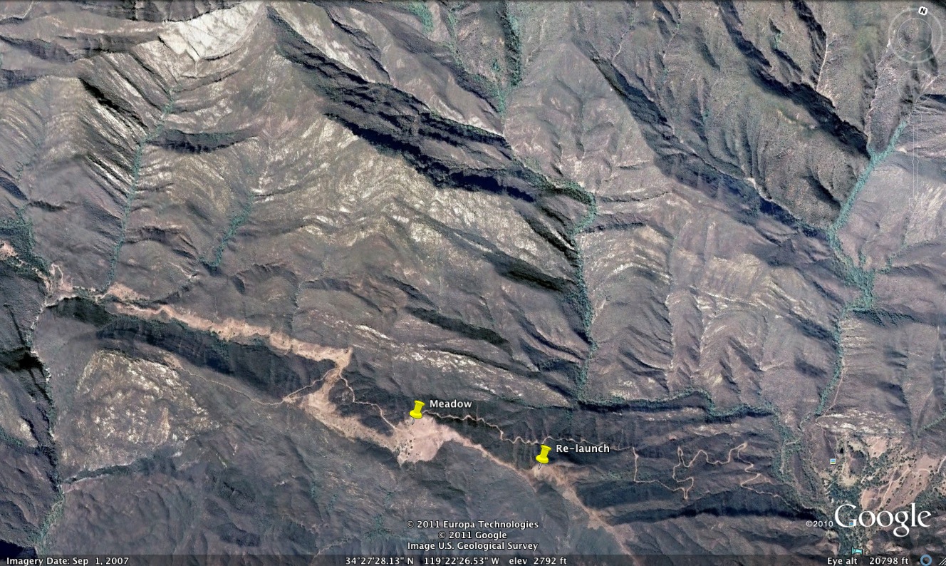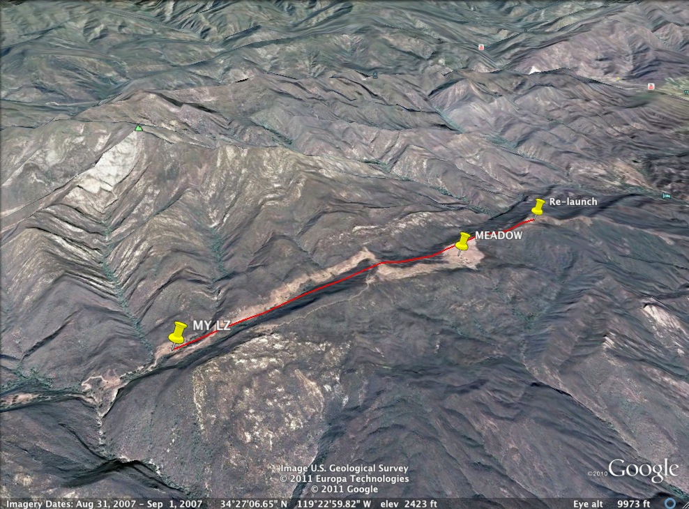 Well, I got my ass through the pass but not all the way to Ojai. Launched Eliminator around 11 with JR, Willy and Jay. We had to scratch around below the antennae farm for a while but eventually got up to base around 43. Headed east from the RR and it was fun flying to the power lines with light winds aloft. JR was patiently making it work at east divide so I decided to push on from west divide at 47 or so and join him just before he moved on to white ledge. I didn't really find much as I about 500 ft lower than him but thinking back on it now I should have slowed down here like JR had and worked everything I could in order to stick to the high ground. Instead, I pushed on to the west spine of white ledge thinking I could get something there. With no luck, I ran out of options and had to put it down in one of the clearings along the fire road. It wasn't a bad landing back there since the forest service or whoever had done a fair amount of brush clearing. I was bummed to be on the ground but way happier to have made it to the dirt road! JR pushed on into Ojai while I packed up. I left my wing there and started hiking out east towards Ojai. Once I reached a high point on the road about a mile up I called my wife and did some sweet talking to get picked up. I gave her the coordinates and from here I still had about 3 or 4 miles to get to the locked gate. It took another hour and half or so of hiking out and right when I got to the gate Ashley pulled up. Luckily, the gate was already open so I decided to take my car back as far I as I could without getting stuck since it was really muddy. We got to the ridge top and it was too risky to take my 2wd car down the road all the way to my glider so we hiked in almost a mile and carried it back up to my car. Ashley was a trooper and didn't complain once. A few weeks ago we had talked about doing some backpacking in Ojai to which she kindly hinted that this wasn't exactly what she had in mind! All in all, it was a great learning experience and we even made it back in time for a fun night at the Banff film festival.