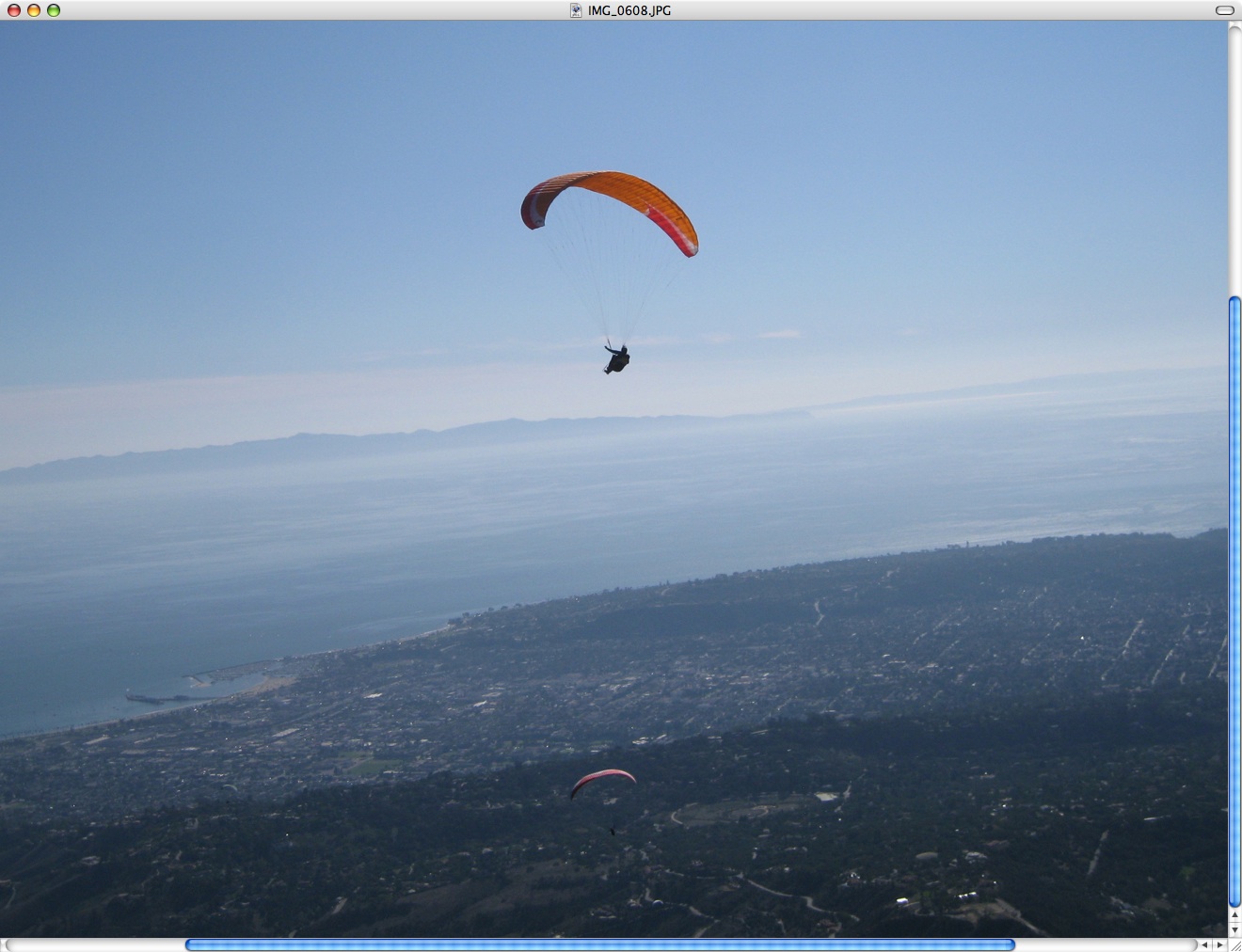 Oh yeah, sweet flying weekend! Had nice fishbowl flight between the RNR, Skyport, and Thermal Factory Saturday, then out to the beach to join the crew. 3800' a few times...took a few pics, a few of jon and kevin and redtail. later rode my bike from the Mesa to Parma for car retreive and exercise. Sunday was a bit better until the high clouds came in...I got decently up over Skyport and felt out the nooks and cranies of the East side of RnR while following lots of swifts intermittantly gliding and boosting up between spines. Low over the saddle, just below the rocks I connected nicely and got to climb out with lots of folks. Chris marked a nice thermal tracking in from the SE, just E of the saddle, we took that over 4k'...I left to EJ bowl and milked the ridge lift while chasing more swifts over to La Cumbre to join Aaron, easy figure eights up the face and over the top. Aaron left I stayed and it seemed to come together and reside, come together and reside up to 5k' - woohoo! Turned toward Alternator with a solid 13mph tailwind from the East...connected in front, thanks to a redtail marking the spot. Climbed back up to 5.1k'. Turned to No-Name. The clouds were in and everything was shaded...no lift over No-Name - should of taken the clue...no lift over the VOR, top of the spine to bottom...went to No-Name (since it was SW low) out front, skimmed bushes and maintained at 2500' for too long, some sun poped thru I was making progress but it shaded in again...I left for West Bowl and ridge soared it to the center spine, and got that sinking feeling...over the lines and out to Cocopah for a smooth landing. Left my dead battery cellphone in the car at launch...decided to walk home...Chris picked me up at Los Positas and Modoc. He offered to drive to launch to retrieve but I really needed to complete my detoxification program so rode from the Mesa to launch to pick up my rig. Nice sunset scary ride. 8)