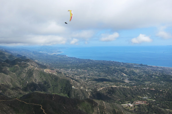 Dean gave me a heads up last night that he might come this way to fly Santa Barbara. Now, I've had several calls over the last 6 months from Dean stating things were shaping up, but I believe this is only the second day I've seen Dean actually show up. Yep it was going to be a spectacular day. Jim packed a very full van of work skipping junkies and we headed up the hill around 10:30. Conditions were good on launch with light cycles coming in and a relatively low cloudbase. Leeside Lee hucked first and seemed to be floating about without any effort at all. As more pilots launched into the magic buoyant air I was really jonesing to get going, but Mr. Stratton was standing on my tail feathers telling me to wait for even better conditions. It was painful to watch everyone enjoying the smooth easy lift and not be flying, but I held out till everyone had left and finally launched around 1pm.