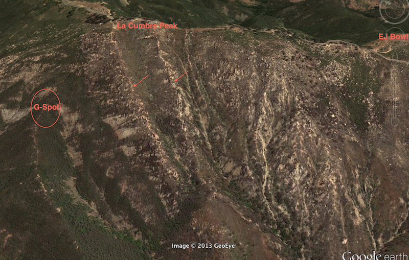 so for those of you unfamiliar with la cumbre peak, it is an awesome peak to dive back at with little to no consequences(often shooting you to the moon), as you can get super low and always squeak around cathedral to one side or the other and land at robbins if needed. if leaving even with ej bowl(try to leave higher), i hug the terrain, and skip the rocky spines where the arrows are in the image unless they are booming. if you can come in at the g-spot or higher it is much more consistent. the g-spot is where the bushy flat spine meets the rocky la cumbre mountain. that spine is easy to recognize as it heads southeast way into the canyon between la cumbre and cathedral. i always aim for the g-spot when surfing the ridge from altenator to la cumbre too. hope your flights were grand today, it looked real nice up there, #$@%#!#^@!
