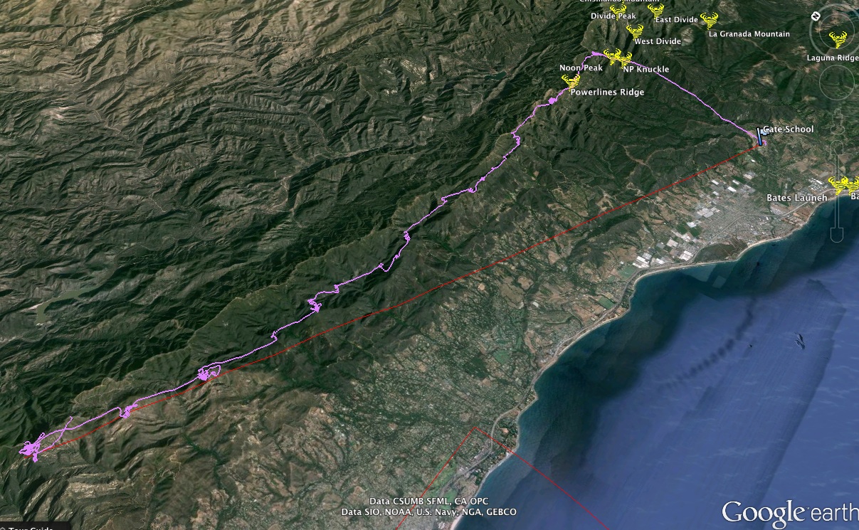 Everyone got off ok, but the early cycles were light from the east. Midway through the launch queue it clocked around to come straight in with a little more gusto, maybe 5 to 8 or 9. Aaron did the early (11 am) light cycle cross from the east honors followed by Chad. The first gaggle got up good at launch then higher over La Cumbre Peak before rounding the VOR turn-point. Aaron turned at Divide Peak on his eastbound leg and got back to Summerland on an upwind glide. Neal and Tim Barker went to Ojai with Tim having a plumbing issue that took him out of the mountains with good altitude to land at Nordhoff High School in light wind from the south. Neal ran into a headwind from the east before fizzling at Thatcher School about 2 PM.