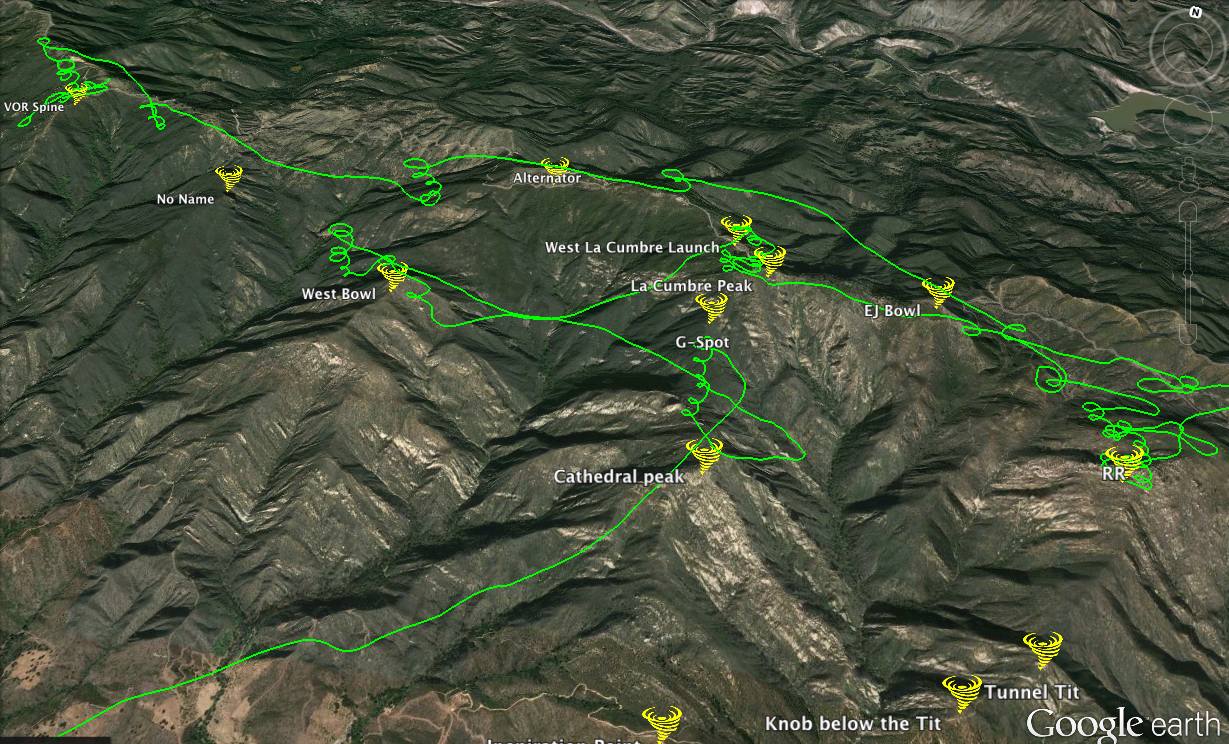 Drove up from T, to VOR at 10ish with: Chris G, Kristen, Dave B., Matt, Chad and couple others. Thermals nice enough to launch but not enough to get swept up vertically out from your shoes like yesterday and Friday, so that was nice. Chad took the first swing and promptly disappeared over us... like 6 or more grand? Everyone else followed, I launched dead last, and (flight track) of course didn't catch anything, toolied down the spine and finally hooked in and easily (thank god, i don't need to flush already do I?) got up to go over No Name, then West Bowl, then join the rest of the fun in the fishbowl 'proper'