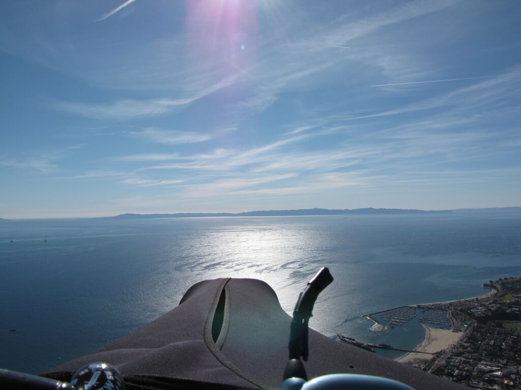 Boyah! It was a stellar day! I launched around 11 and Dean and I scratched around the TF for 30 minutes or so before I got the ride to 3900 that I was looking for. Andy D had just made the glide to Montecito and I followed all too willingly. Dean decided to go West so we didn't see him much after the TF. Got a bunch of turns in over shadow before hitting the volcano at montecito. The tops were consistently 4k but you'd get down to 3100 on the crossings and it was rowdy and disorganized below 3300. Once you got through 3300 you knew you were ok. I followed Andy and Art down a few peaks before we bailed out for Padaro lane. We knew it wasn't the day for the pass but it was SO tempting. I tried to get a shot of the dolphins below us on a deep pass over the ocean but they didn't come out. Quick ride back to launch in Andy D's truck and the 3 of us had some spectacular flights at 2pm. We ran into Milley at Parma and he turned down a second flight.....That'll learn ya! The lift had smoothed and the rides were bonehead to 4k. We all bailed for East Beach and made it easily with tank-ups over the Riviera. Spectacular way to get my feet wet again after 6 months off and it was great to see so many pilots having a go at it! Looked like Brian Stratton took a shot downrange and came up one beach short of Padaro. A new generation of pilots are about to send it through the pass!