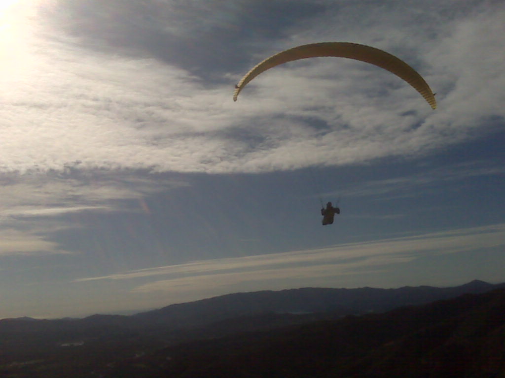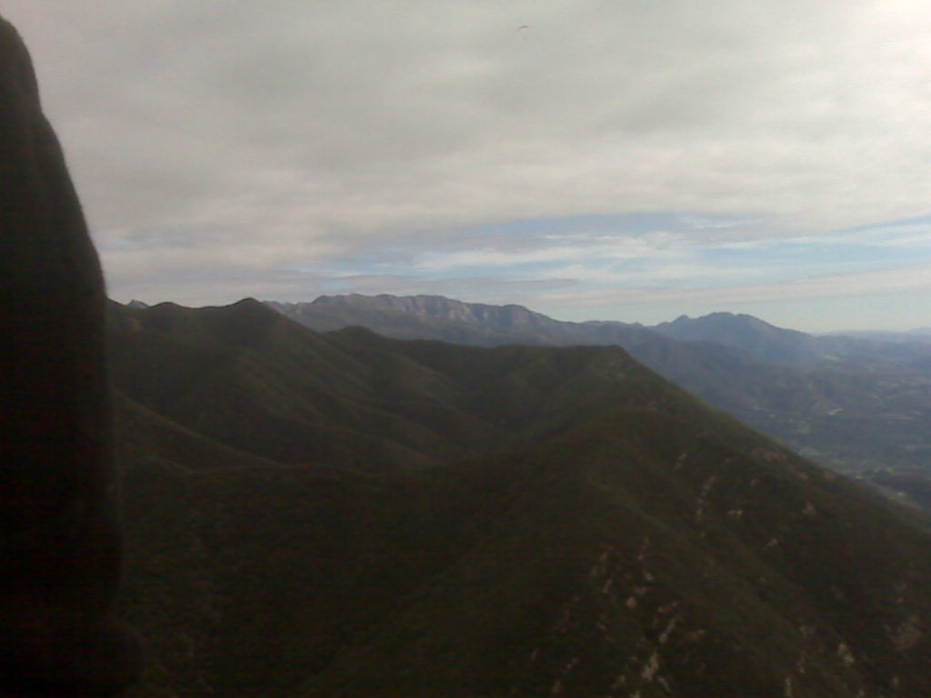 Awoke this AM to sunshine and distant high clouds. BL Top in SB seemed a bit weak and Ojai had a 25º spread so I called a 10 AM meet at the HS for Nuthouse but by the time I was out of the shower it was clouding over pretty heavily. Started to have my doubts but figured a wee hike on New Years Day would do me good anyway. 3rd annual! Andy D met me at the HS and we were on trail by 10 past 10. The clouds had pretty solidly covered the sky except for a band of sun marching toward us from SB. It made the hike easy! By the time we were 3/4 of the way up, we had perfect sun again and cycles were starting to come through. Couldn't have timed it better. On launch by 11 with stellar cycles and lots of sun but we could see leading edge of the cold front coming in from SB with associated shade. We were going to have a window and it was going to be relatively short. I was off by 11:25, after getting hoovered from launch like an upside down bungee jump. Easy climb to 23 and surfed across a few spines before hitting ridgetop. I looked back for Andy and saw heavy shade had already covered Matillija dam which I was sure was going to shut things down permanently. It was a race to the Pyramid to get established before it started to suck. Andy got caught in some shade and had to wait for cycles but finally got off and joined me on the ridge. Most climbs capped at 32ish but near the Pyramid they jumped to the mid 4s. Lift was smooth, light and easy and by the time Andy hit the ridge top everything was in solid shade. We could see clouds tickling the top of Pine and Reyes, dumping snow. Beautiful scenery over the back. We had aspirations of making Chief's but I ran into a pretty solid East wind at the West end of Nordhoff and some very strange air. It had been an amazing day which great climbs in total shade, and we had the HS on glide. Easy decision and we both headed out. Chief's with 4500 into a good headwind just didn't seem likely.