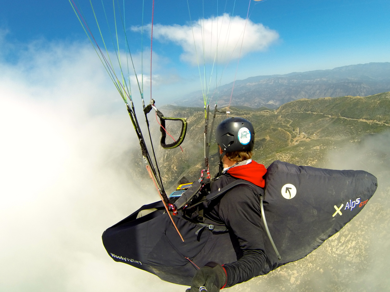 Bob Hurlbett and I arrived at Skyport at 11:30 AM to take advantage of an unusual low pressure day in May in Santa Barbara. There was a low cloudbase out front, but the day obviously had potential. Cycles were decently strong at launch and Marge and Kevin and another pilot were set up to go. The air was mixing a bit and there was a bit of east in it, making for a few unsuccessful attempts when people pulled up. The others got off; I spread out Bob and he had a perfect launch leaving me alone as the last pilot to go. For some reason, I thought I had a line-through on one riser and I did some acrobatics stepping over and through lines trying to get it straightened out without unclipping my risers or getting out of my harness. This only added to my impatience to get off and join the others going downrange in the great conditions of lift everywhere. Padaro Grill, here I come.