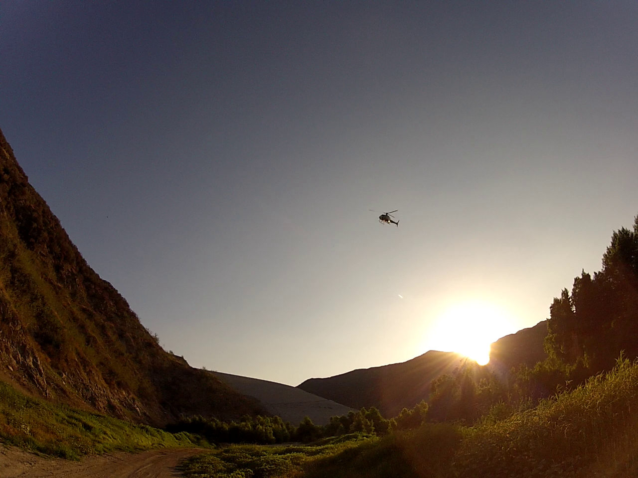 The Spot has a 10-minute tracking subscription but no one I was with that day had any knowledge of where to find it on the web. Note to self: Put the url on a big sign and leave it inside my car on the front seat or inside the windshield. I continued to backtrack from the dead end toward the fork in the road when the helicopter made it's egress from my glider along the dry river. I waved as it flew right over my head and kept on going but not until I reached into my hip pocket for my signal mirror. I use the retro-reflective aiming device to place the image of the sun right on the cockpit as it continued away. Then it stopped just past the dam and yawed around then dropped its nose and dove at me. Once I was certain this was no fluke I put the mirror away.