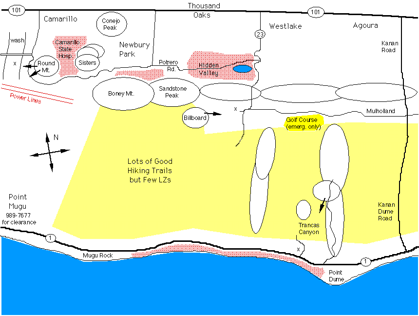Take the 101 freeway into the Camarillo area and exit at Las Posas Rd. heading toward the coast. Follow this road for 3 or 4 miles until the first stop sign at Lewis Ave. Turn left on Lewis and the site is the hill directly ahead. In about half a mile you will pass over a bridge at the LZ. Past the bridge bear left and go another 100 to 200 yards and turn right at gate. Follow dirt road around the side of the hill until you reach dirt track on your right heading to the top.